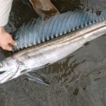 Parlando della sua descrizione, bisogna sottolineare il suo aspetto feroce, soprattutto a causa della sua bocca profonda armata di grandi denti caniniformi che sporgono al di sopra degli occhi molto grandi. Il suo corpo è slanciato e sottile, con una sezione cilindrica, e ha una pinna dorsale lunghissima e molto alta con i primi raggi filiformi allungati. C’è anche una piccola pinna adiposa e una pinna caudale profondamente forcuta, con il lobo superiore che presenta un prolungamento filiforme. La pinna anale è bassa, mentre le pinne ventrali sono arretrate e le pinne pettorali sono lunghe ed inserite in basso sul corpo. Questo animale è molto fragile e il suo colore è un bronzo iridescente con fitti punti scuri. Le pinne sono nere e può raggiungere sicuramente una lunghezza di 1,5 metri, ma sembra poter arrivare anche ai 2 metri. Il fatto di essere un predatore temuto da molte specie non lo rende immune dall’essere predato a sua volta da altri animali. Sono infatti riportati casi di predazioni da parte di squali, tonni o da Pinnipedi quali foche o leoni marini.